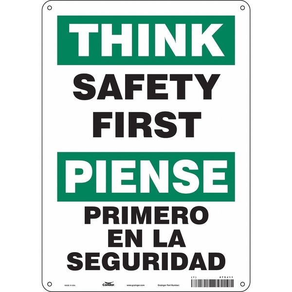 Safety Sign, Vertical Rectangle, Number of Printed Sides 1, English, Spanish, Sign Format Other Format, Sign Legend Safety First/Piense Primero En La Seguridad, Sign Legend Background Color Green, White, Sign Legend Style Text