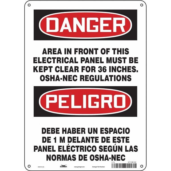 Safety Sign, Vertical Rectangle, Number of Printed Sides 1, English, Spanish, Sign Format Traditional OSHA, Sign Legend Area In Front Of This Electrical Panel Must Be Kept Clear For 36 Inches. OSHA-NEC Regulations/Debe Haber Un Espacio De 1M Delante De Este Panel Electrico De Acuerdo Las Normas De OSHA-NEC, Sign Legend Background Color White, Sign Legend Style Text