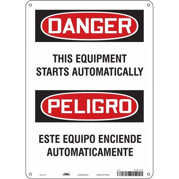 Safety Sign, Vertical Rectangle, Number of Printed Sides 1, English, Spanish, Sign Format Traditional OSHA, Sign Legend This Equipment Starts Automatically/Este Equipo Encinde Automaticamente, Sign Legend Background Color White, Sign Legend Style Text