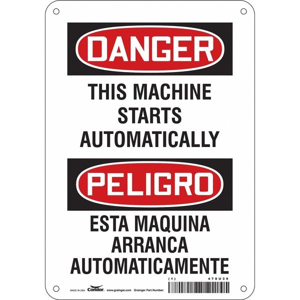 Safety Sign, Vertical Rectangle, Number of Printed Sides 1, English, Spanish, Sign Format Traditional OSHA, Sign Legend This Machine Starts Automatically/Esta Maquina Arranca Automaticamente, Sign Legend Background Color White, Sign Legend Style Text