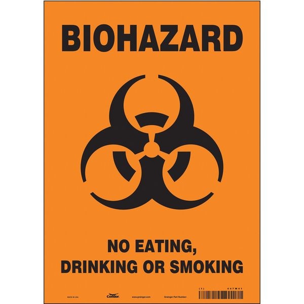 Safety Sign, Vertical Rectangle, Number of Printed Sides 1, English, Sign Format Other Format, Sign Legend Biohazard No Eating, Drinking Or Smoking, Sign Legend Background Color Orange, Sign Legend Style Symbol and Text