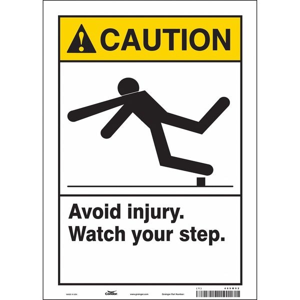 Safety Sign, Vertical Rectangle, Number of Printed Sides 1, English, Sign Format ANSI/OSHA Format, Sign Legend Avoid Injury. Watch Your Step., Sign Legend Background Color White, Sign Legend Style Symbol and Text