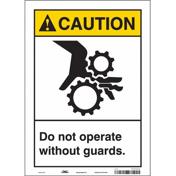 Safety Sign, Vertical Rectangle, Number of Printed Sides 1, English, Sign Format ANSI/OSHA Format, Sign Legend Do Not Operate Without Guards., Sign Legend Background Color White, Sign Legend Style Symbol and Text