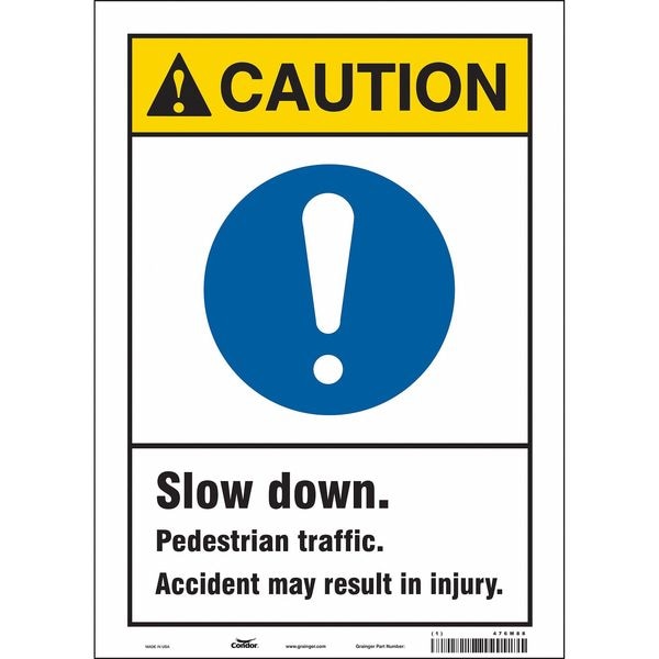 Safety Sign, Vertical Rectangle, Number of Printed Sides 1, English, Sign Format ANSI/OSHA Format, Sign Legend Slow Down. Pedestrian Traffic. Accident May Result In Injury., Sign Legend Background Color White, Sign Legend Style Symbol and Text