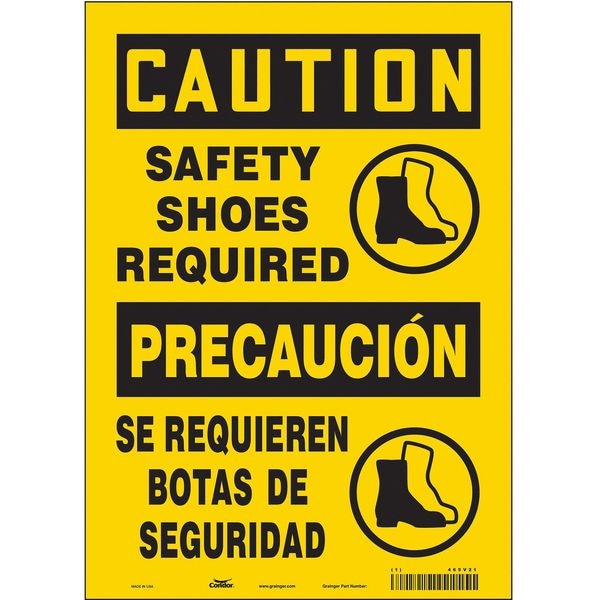 Safety Sign, Vertical Rectangle, Number of Printed Sides 1, English, Spanish, Sign Format Traditional OSHA, Sign Legend Safety Shoes Required/Se Requieren Botas De Seguridad, Sign Legend Background Color Yellow, Sign Legend Style Symbol and Text