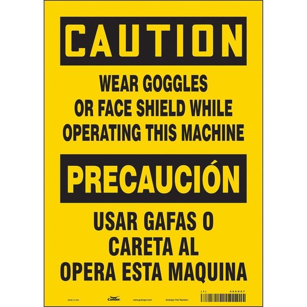 Safety Sign, Vertical Rectangle, Number of Printed Sides 1, English, Spanish, Sign Format Traditional OSHA, Sign Legend Wear Goggles Or Face Shield While Operating This Machine/Usar Gafas O Careta Al Opera Esta Maquina, Sign Legend Background Color Yellow, Sign Legend Style Text