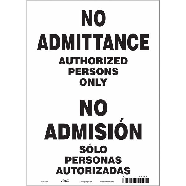 Safety Sign, Vertical Rectangle, Number of Printed Sides 1, English, Spanish, Sign Format Other Format, Sign Legend No Admittance Authorized Persons Only/No Admision Solo Personas Autorizadas, Sign Legend Background Color White, Sign Legend Style Text