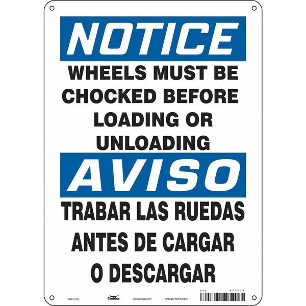 Safety Sign, Vertical Rectangle, Number of Printed Sides 1, English, Spanish, Sign Format Traditional OSHA, Sign Legend Wheels Must Be Chocked Before Loading Or Unloading/ Trabar Las Ruedas Antes De Cargar O Descargar, Sign Legend Background Color White, Sign Legend Style Text