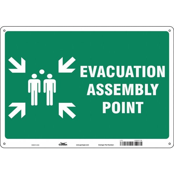 Safety Sign, Horizontal Rectangle, Number of Printed Sides 1, English, Sign Legend Evacuation Assembly Point, Sign Legend Background Color Green, Sign Legend Style Symbol and Text
