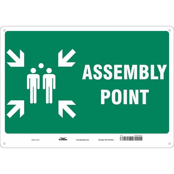 Safety Sign, Horizontal Rectangle, Number of Printed Sides 1, English, Sign Legend Assembly Point, Sign Legend Background Color Green, Sign Legend Style Symbol and Text