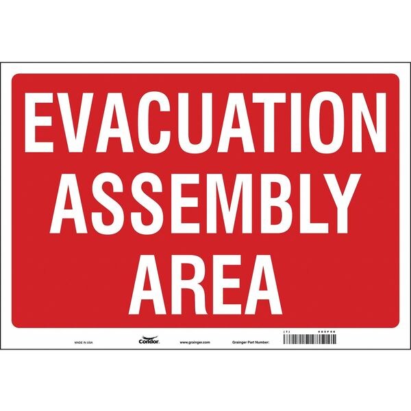 Safety Sign, Horizontal Rectangle, Number of Printed Sides 1, English, Sign Legend Evacuation Assembly Area, Sign Legend Background Color Red, Sign Legend Style Text