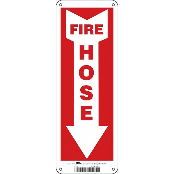 Safety Sign, Horizontal Rectangle, Number of Printed Sides 1, English, Sign Format Other Format, Sign Legend Fire Hose, Sign Legend Background Color Red, White, Sign Legend Style Symbol and Text