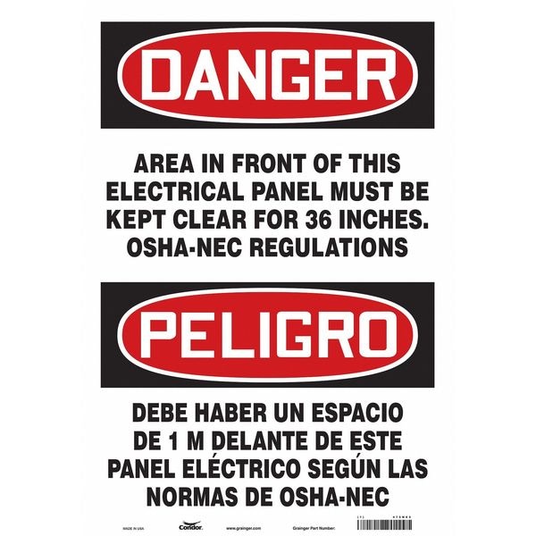Safety Sign, Vertical Rectangle, Number of Printed Sides 1, English, Spanish, Sign Format Traditional OSHA, Sign Legend Area In Front Of This Electrical Panel Must Be Kept Clear For 36 Inches. OSHA-NEC Regulations/Debe Haber Un Espacio De 1M Delante De Este Panel Electrico De Acuerdo Las Normas De OSHA-NEC, Sign Legend Background Color White, Sign Legend Style Text