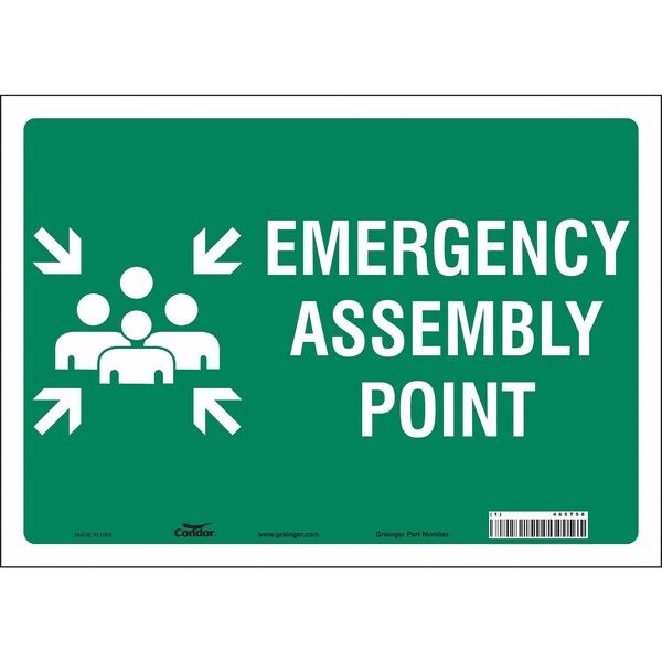 Safety Sign, Horizontal Rectangle, Number of Printed Sides 1, English, Sign Legend Emergency Assembly Point, Sign Legend Background Color Green, Sign Legend Style Symbol and Text
