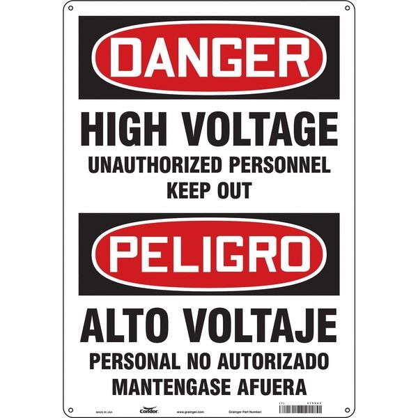 Safety Sign, Vertical Rectangle, Number of Printed Sides 1, English, Spanish, Sign Format Traditional OSHA, Sign Legend High Voltage Unauthorized Personnel Keep Out/Alto Voltaje Personal No Autorizado Mantengase Afuera, Sign Legend Background Color White, Sign Legend Style Text