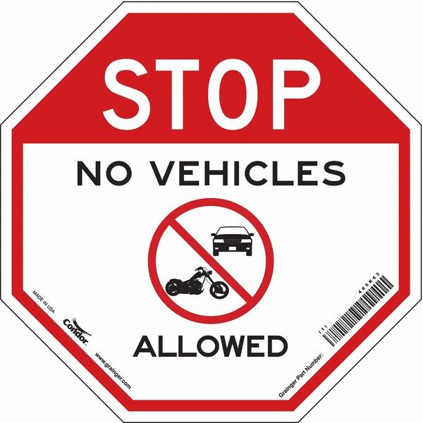 Safety Sign, Octagon, Number of Printed Sides 1, English, Sign Format Other Format, Sign Legend Stop No Vehicles Allowed, Sign Legend Background Color Red, White, Sign Legend Style Symbol and Text