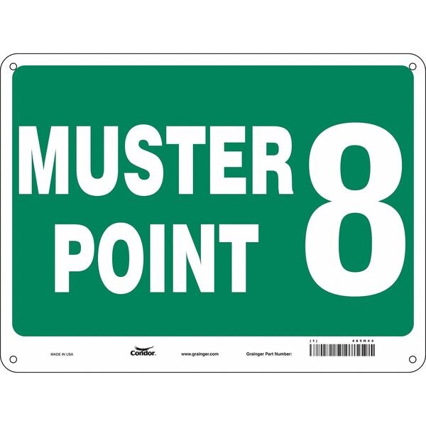 Safety Sign, Horizontal Rectangle, Number of Printed Sides 1, English, Sign Format Other Format, Sign Legend Muster Point 8, Sign Legend Background Color Green, Sign Legend Style Text