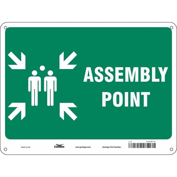 Safety Sign, Horizontal Rectangle, Number of Printed Sides 1, English, Sign Legend Assembly Point, Sign Legend Background Color Green, Sign Legend Style Symbol and Text