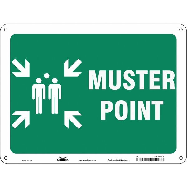 Safety Sign, Horizontal Rectangle, Number of Printed Sides 1, English, Sign Legend Muster Point, Sign Legend Background Color Green, Sign Legend Style Symbol and Text