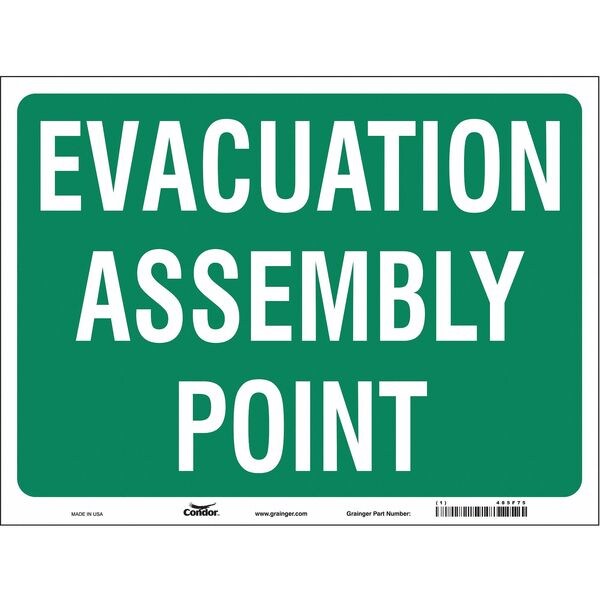 Safety Sign, Horizontal Rectangle, Number of Printed Sides 1, English, Sign Format Other Format, Sign Legend Evacuation Assembly Point, Sign Legend Background Color Green, Sign Legend Style Text