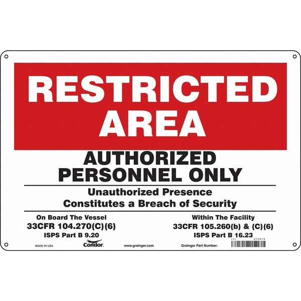 Safety Sign, Horizontal Rectangle, Number of Printed Sides 1, English, Sign Format Other Format, Sign Legend Authorized Personnel Only Unauthorized Presence Constitutes A Breach Of Security On Board Vessel 33Cfr 104.270(C)(6) ISPS Part B 9.20 Within The Facility 33Cfr 105.260(B)&(C)(6) ISPS Part B 15.23, Sign Legend Background Color Red, White, Sign Legend Style Text