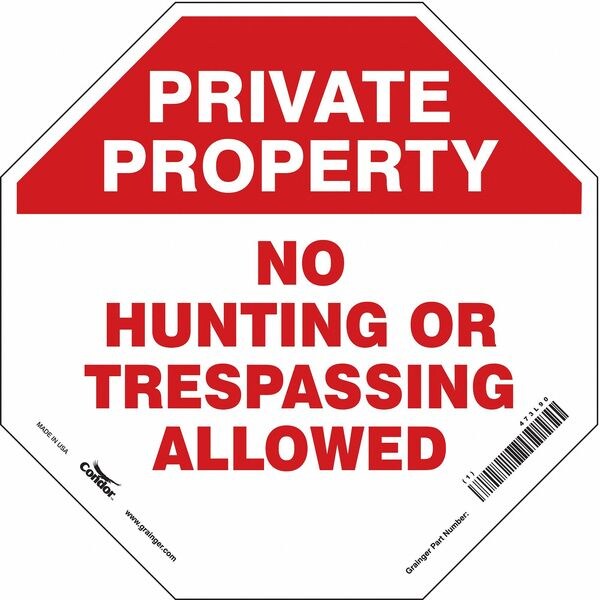 Safety Sign, Octagon, Number of Printed Sides 1, English, Sign Format Other Format, Sign Legend Private Property No Hunting Or Trespassing Allowed, Sign Legend Background Color Red, White, Sign Legend Style Text