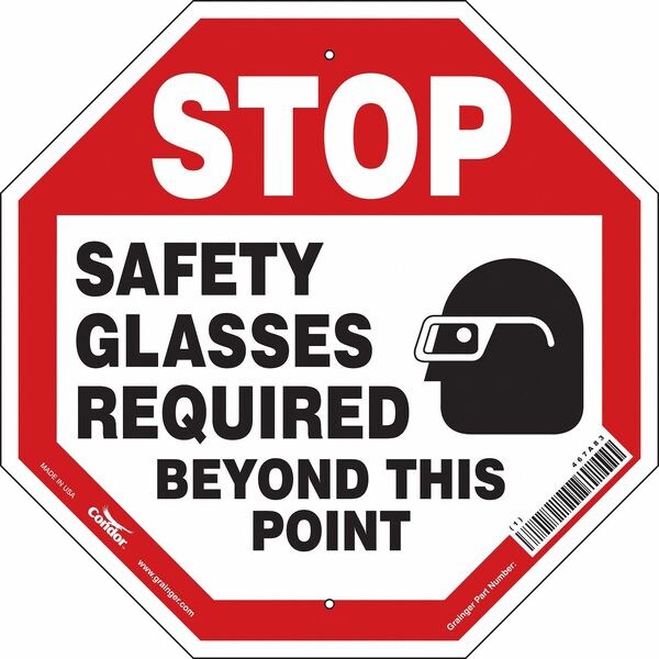 Safety Sign, Octagon, Number of Printed Sides 1, English, Sign Format Other Format, Sign Legend Stop Safety Glasses Required Beyond This Point, Sign Legend Background Color Red, White, Sign Legend Style Symbol and Text