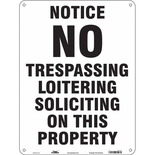 Safety Sign, Vertical Rectangle, Number of Printed Sides 1, English, Sign Format Other Format, Sign Legend No Trespassing Loitering Soliciting On This Property, Sign Legend Background Color White, Sign Legend Style Text