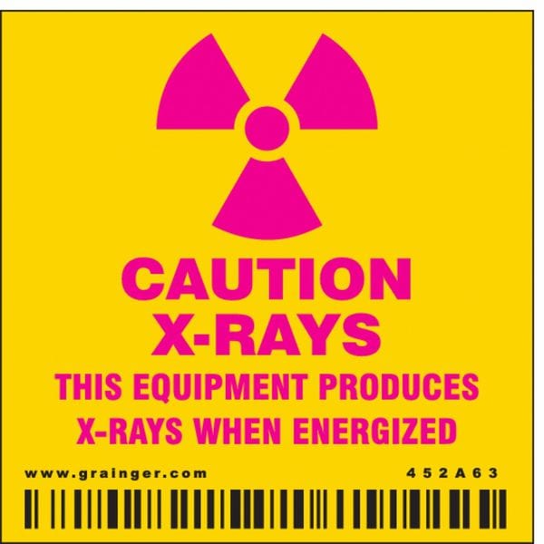 Safety Sign, Square, Number of Printed Sides 1, English, Sign Format Other Format, Sign Legend Caution X-Rays This Equipment Produces X-Rays When Energized, Sign Legend Background Color Yellow, Sign Legend Style Symbol and Text