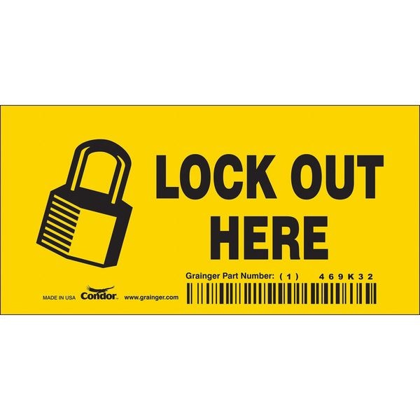 Safety Sign, Horizontal Rectangle, Number of Printed Sides 1, English, Sign Format Other Format, Sign Legend Lock Out Here, Sign Legend Background Color Yellow, Sign Legend Style Symbol and Text
