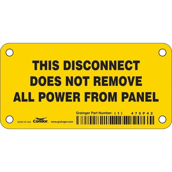 Safety Sign, Horizontal Rectangle, Number of Printed Sides 1, English, Sign Format Other Format, Sign Legend This Disconnect Does Not Remove All Power From Panel, Sign Legend Background Color Yellow, Sign Legend Style Symbol and Text
