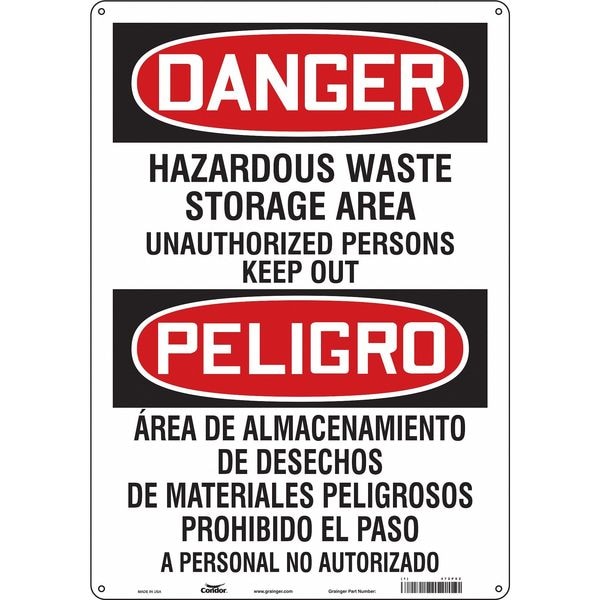Safety Sign, Vertical Rectangle, Number of Printed Sides 1, English, Spanish, Sign Format Traditional OSHA, Sign Legend Hazardous Waste Storage Area Unauthorized Persons Keep Out/Area De Almacenamiento De Desechos De Materiales Peligrosos. Prohibido El Paso A Personal No Autorizado, Sign Legend Background Color White, Sign Legend Style Text