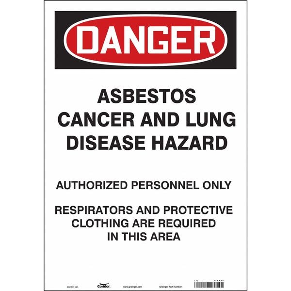Safety Sign, Vertical Rectangle, Number of Printed Sides 1, English, Sign Format Traditional OSHA, Sign Legend Asbestos Cancer And Lung Disease Hazzard Authorized Personnel Only Respirators And Protective Clothing Are Required In This Area, Sign Legend Background Color White, Sign Legend Style Text