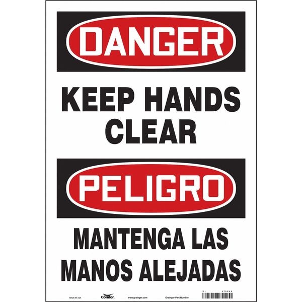 Safety Sign, Vertical Rectangle, Number of Printed Sides 1, English, Spanish, Sign Format Traditional OSHA, Sign Legend Keep Hands Clear/Mantener Las Manos Alejadas, Sign Legend Background Color White, Sign Legend Style Text