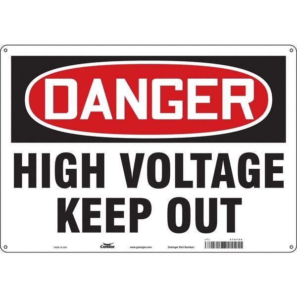Safety Sign, Horizontal Rectangle, Number of Printed Sides 1, English, Sign Format Traditional OSHA, Sign Legend High Voltage Keep Out, Sign Legend Background Color White, Sign Legend Style Text