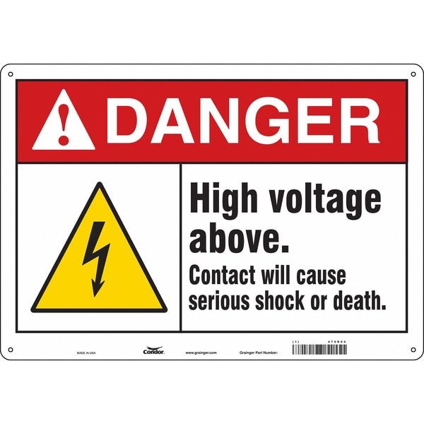 Safety Sign, Horizontal Rectangle, Number of Printed Sides 1, English, Sign Format ANSI/OSHA Format, Sign Legend High Voltage Above. Contact Will Cause Serious Shock Or Death., Sign Legend Background Color White, Sign Legend Style Symbol and Text