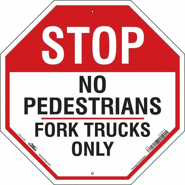 Safety Sign, Octagon, Number of Printed Sides 1, English, Sign Format Other Format, Sign Legend Stop No Pedestrians Fork Trucks Only, Sign Legend Background Color Red, White, Sign Legend Style Text
