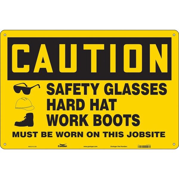 Safety Sign, Horizontal Rectangle, Number of Printed Sides 1, English, Sign Format Traditional OSHA, Sign Legend Safety Glasses Hard Hat Work Boots Must Be Worn On This Jobsite, Sign Legend Background Color Yellow, Sign Legend Style Symbol and Text