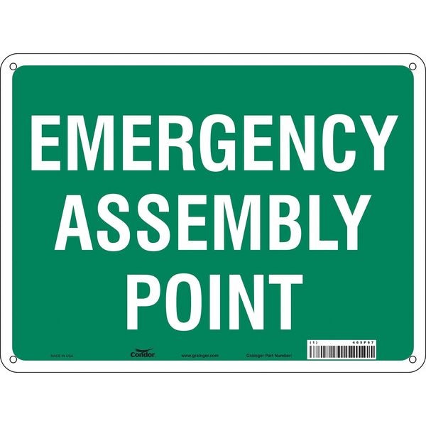 Safety Sign, Horizontal Rectangle, Number of Printed Sides 1, English, Sign Legend Emergency Assembly Point, Sign Legend Background Color Green, Sign Legend Style Text