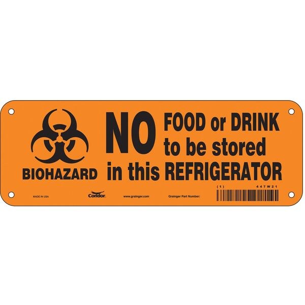 Safety Sign, Vertical Rectangle, Number of Printed Sides 1, English, Sign Format Other Format, Sign Legend Biohazard No Food Or Drink To Be Stored In This Refrigerator, Sign Legend Background Color Orange, Sign Legend Style Symbol and Text