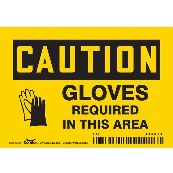 Safety Sign, Horizontal Rectangle, Number of Printed Sides 1, English, Sign Format Traditional OSHA, Sign Legend Gloves Required In This Area, Sign Legend Background Color Yellow, Sign Legend Style Symbol and Text