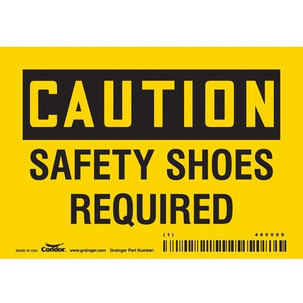 Safety Sign, Horizontal Rectangle, Number of Printed Sides 1, English, Sign Format Traditional OSHA, Sign Legend Safety Shoes Required, Sign Legend Background Color Yellow, Sign Legend Style Text
