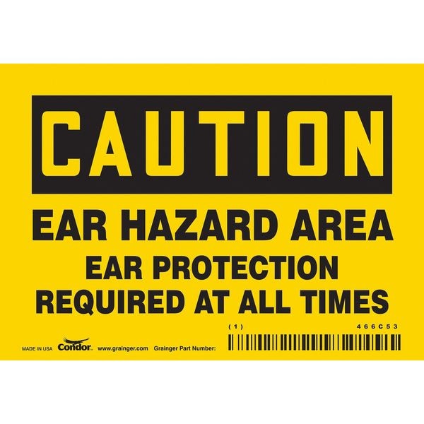 Safety Sign, Horizontal Rectangle, Number of Printed Sides 1, English, Sign Format Traditional OSHA, Sign Legend Ear Hazard Area Ear Protection Required At All Times, Sign Legend Background Color Yellow, Sign Legend Style Text