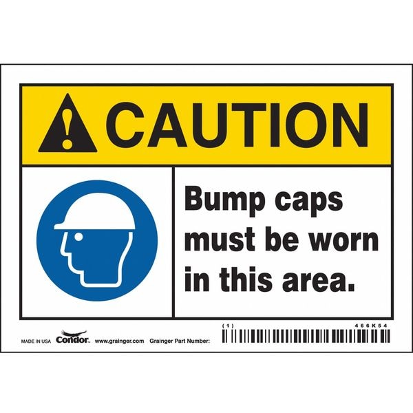 Safety Sign, Horizontal Rectangle, Number of Printed Sides 1, English, Sign Format ANSI/OSHA Format, Sign Legend Bump Caps Must Be Worn In This Area., Sign Legend Background Color White, Sign Legend Style Symbol and Text