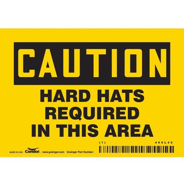 Safety Sign, Horizontal Rectangle, Number of Printed Sides 1, English, Sign Format Traditional OSHA, Sign Legend Hard Hats Required In This Area, Sign Legend Background Color Yellow, Sign Legend Style Text