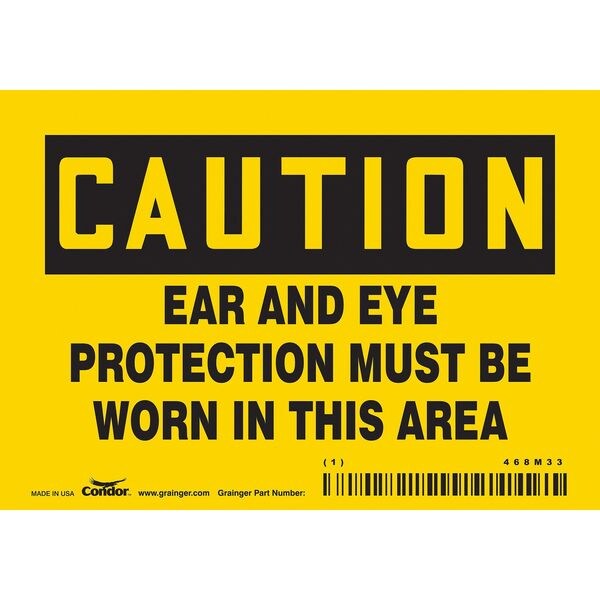 Safety Sign, Horizontal Rectangle, Number of Printed Sides 1, English, Sign Format Traditional OSHA, Sign Legend Ear And Eye Protection Must Be Worn In This Area, Sign Legend Background Color Yellow, Sign Legend Style Text