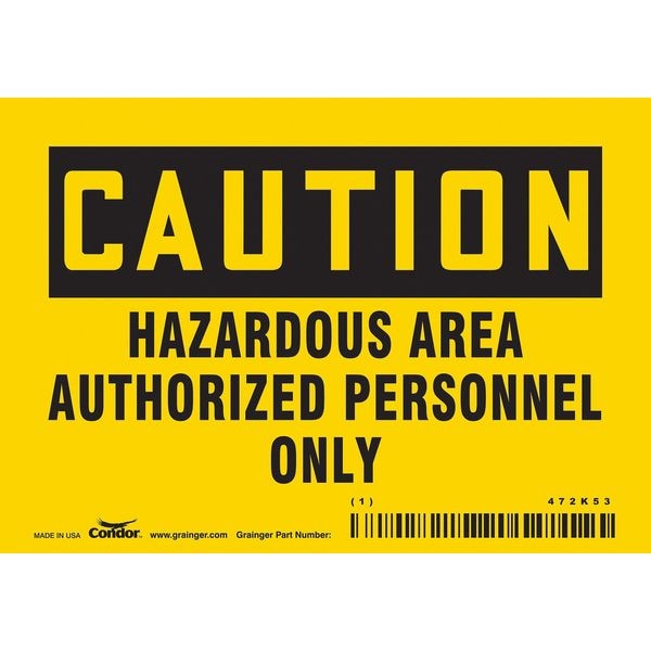 Safety Sign, Horizontal Rectangle, Number of Printed Sides 1, English, Sign Format Traditional OSHA, Sign Legend Hazardous Area Authorized Personnel Only, Sign Legend Background Color Yellow, Sign Legend Style Text