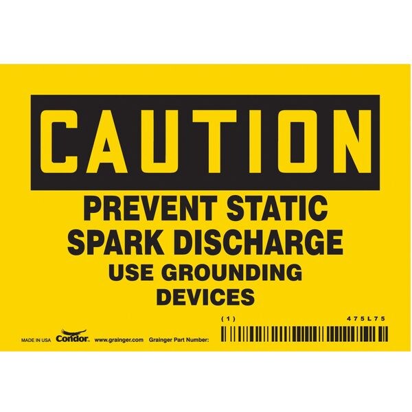 Safety Sign, Horizontal Rectangle, Number of Printed Sides 1, English, Sign Format Traditional OSHA, Sign Legend Prevent Static Spark Discharge Use Grounding Devices, Sign Legend Background Color Yellow, Sign Legend Style Text