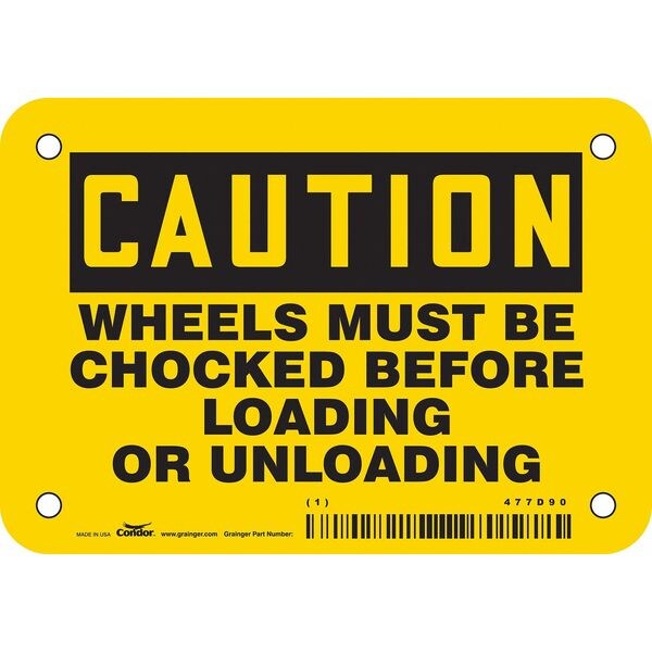 Safety Sign, Horizontal Rectangle, Number of Printed Sides 1, English, Sign Format Traditional OSHA, Sign Legend Wheels Must Be Chocked Before Loading Or Unloading, Sign Legend Background Color Yellow, Sign Legend Style Text
