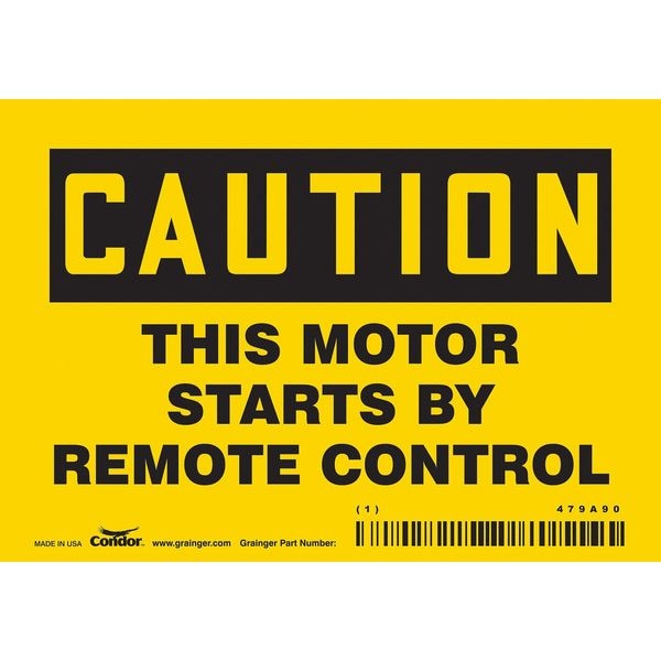 Safety Sign, Horizontal Rectangle, Number of Printed Sides 1, English, Sign Format Traditional OSHA, Sign Legend This Motor Starts By Remote Control, Sign Legend Background Color Yellow, Sign Legend Style Text